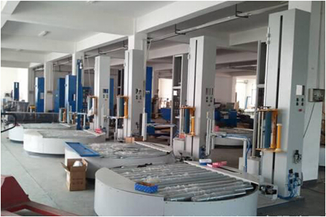 5、在線式薄膜纏繞機,以拉伸膜為包裝材料應用與托盤或棧板,通過輸送線連接。